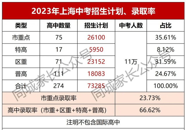 通过数据来看,2023全市中考总数为11万,市重点招生总数为26100人,今年上海中考市重点录取率为23.72%,高中录取率为66.62%。