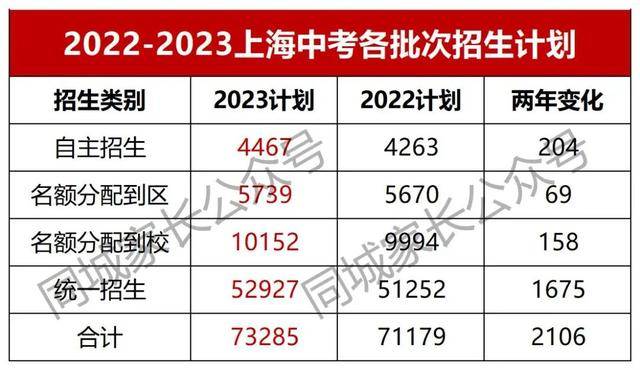 上海中考分为自主招生、名额分配和统一招生(平行志愿)三个录取批次,2023年各批次招生计划合计73285人,对比去年(71179人)增加2106人。
