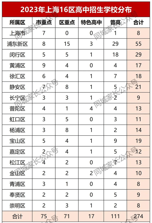 根据市教育考试院发布的2023年上海市高中招生学校名单,2023年全市共有274所高中参加中考招生,其中市重点75所,区重点71所,特色高中17所,普通高中111所。