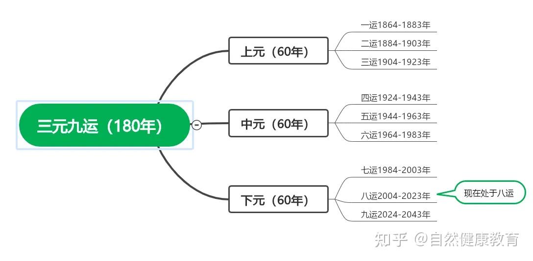 以180年为一个正元,每一个正元,又分为上元、中元、下元、每一元为60年,就是一个甲子,再分为三个运,每个运20年,上元有一运,二运,三运,中元为四运、五运、六运、下元就是七运、八运、九运。