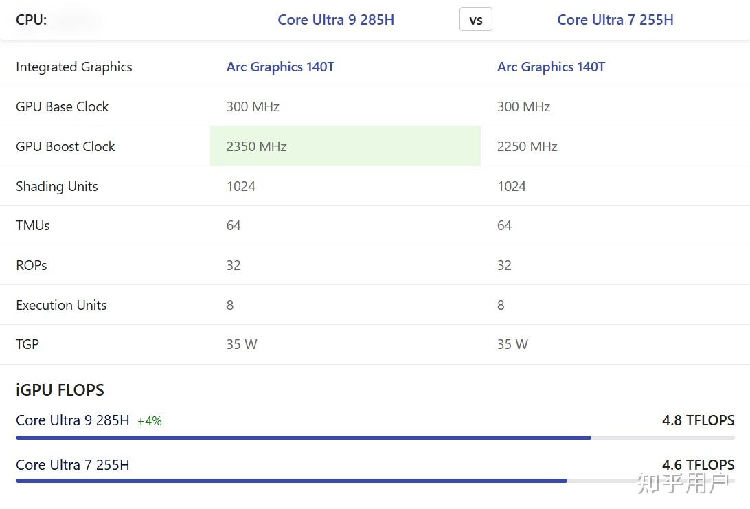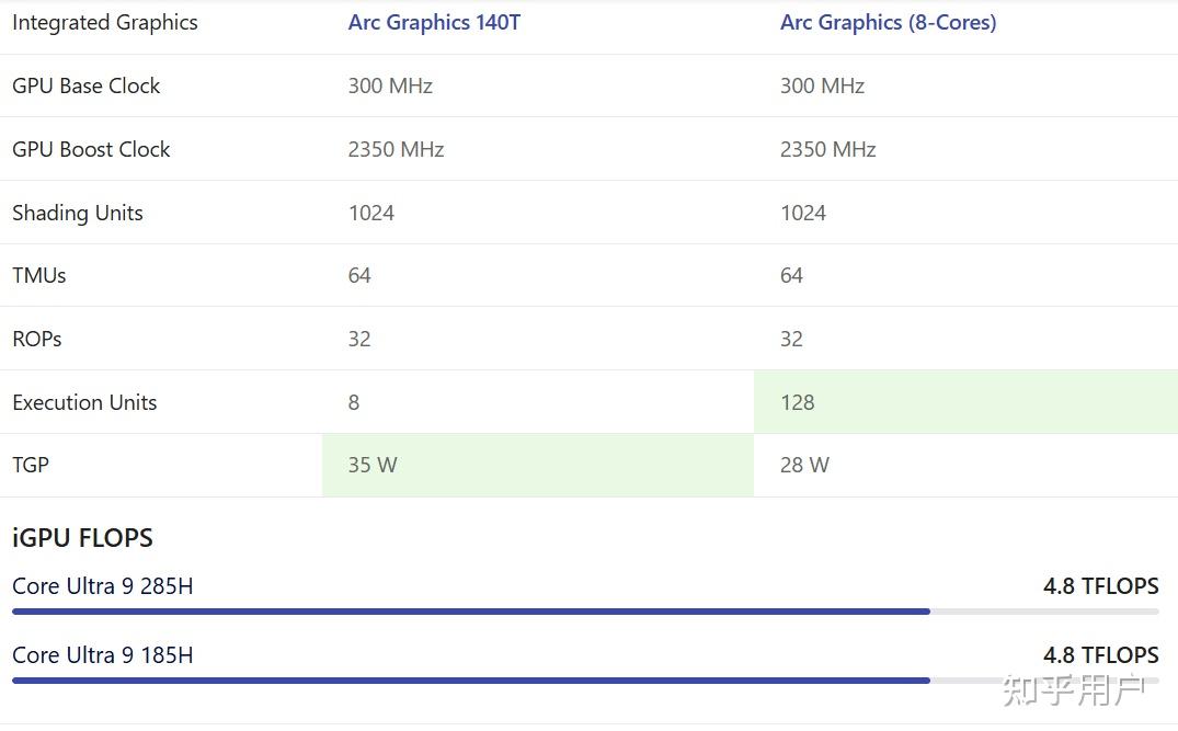 对比ultra 9 185H,它俩的架构不同,但是通过频率、着色器数量、纹理单元、光栅单元等参数等对比,其实这两个核显是相同的。其主要差距在架构和功耗上,如(ultra 9 185H)有执行单元128个,(Ultra 9 285H)核心数8个,在功耗上又有10W的差距,Ultra 9 285H的功耗大,这两种架构不同,功耗也不同,通过参数没法比,只能通过跑分性能对比了。跑分浮点性能,这两个核显TFLOPS都是4.8,说明这两个核显的性能基本是差不多的。
