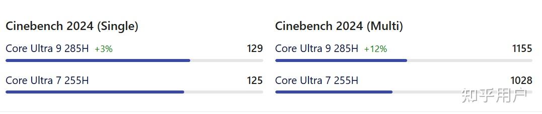 Ultra 9 285H vs Ultra 7 255H:在Cinebench 2024跑分中,单核性能有3%的差距;多核性有12%左右的差距;Ultra 9 285H性能提升不是很明显,尤其单核性提升不大。